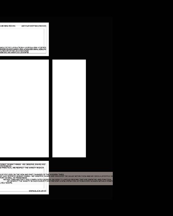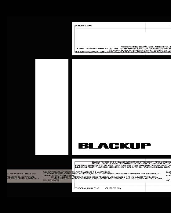BLACKUP SE ENFOCA EN LOS NUEVOS Y RÁPIDOS CAMBIOS DE LOS TIEMPOS MODERNOS. NOS INTERESAN LAS NOVEDADES - OBSERVAMOS, COMPARTIMOS Y DESCUBRIMOS EL VALOR QUE HAY EN ELLOS Y BUSCAMOS UN ESTILO DE VIDA CÓMODO Y A LA MODA. EN LUGAR DE DISEÑOS ABSTRACTOS Y COMPLICADOS, BUSCAMOS DESPLEGAR DISEÑOS QUE SON EMPÁTICOS Y PRÁCTICOS. RESPECTAMOS LA VARIEDAD EN CADA SUJETO Y PRESENTAMOS UNA NUEVA Y FRESCA COLECCIÓN CADA TEMPORADA DENTRO DE UN ÁMBITO PODEROSO Y VIVAZ.